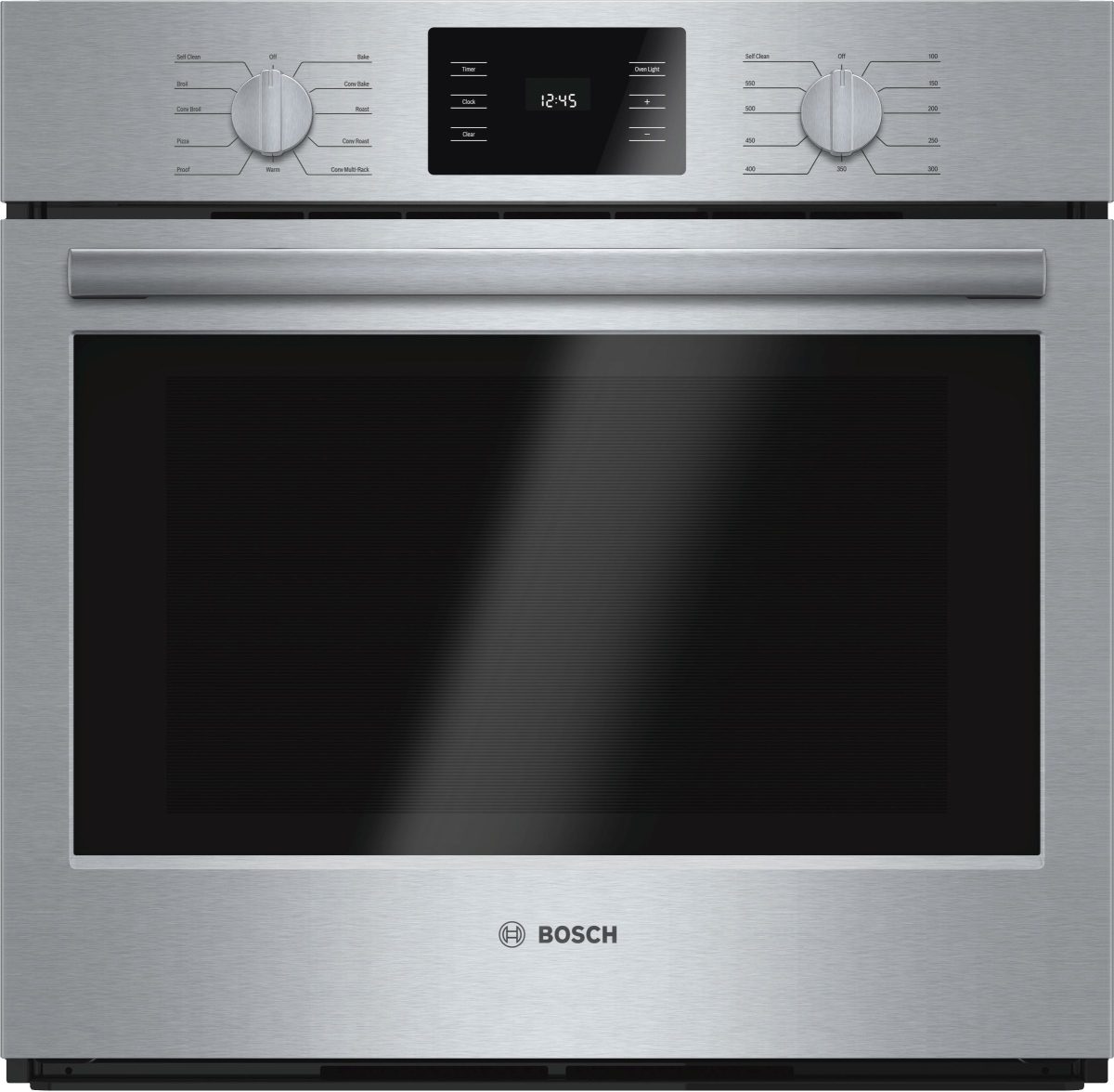 The Bosch Wall Oven Features Genuine European Convection and Heavy Metal Stainless Steel Knobs.