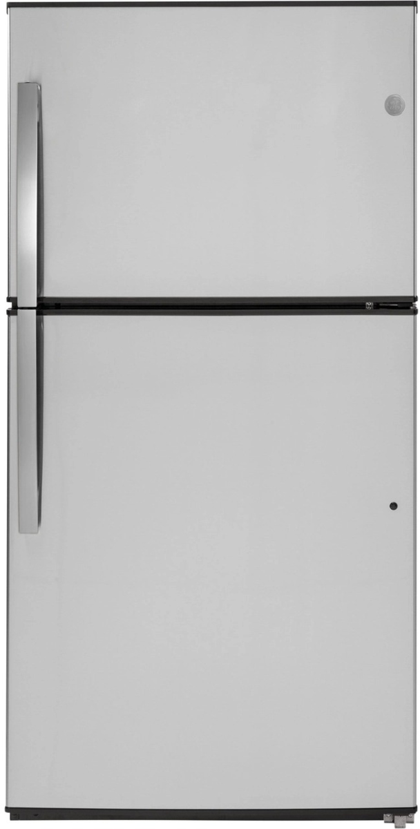 GE® 21.1 Cu. Ft. Top Freezer Refrigerator-Stainless Steel with adjustable glass shelves and factory installed ice makerRead More