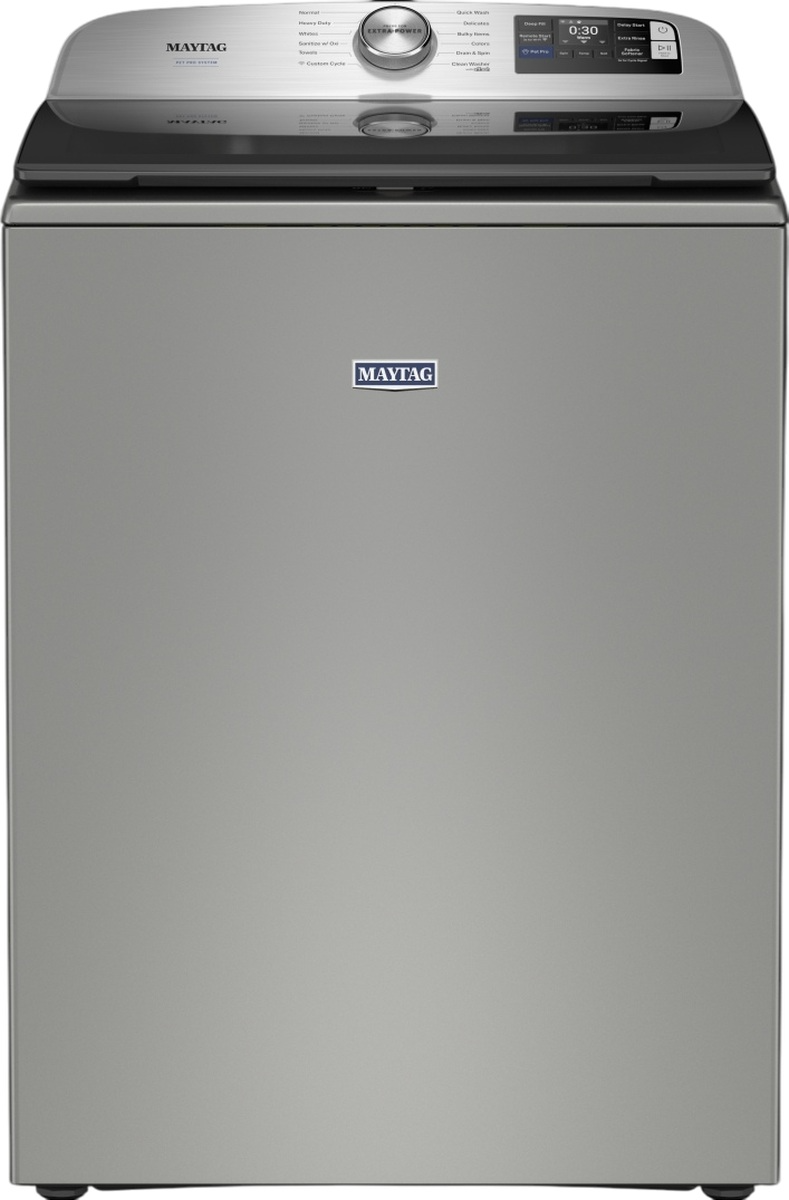Get a clean you can see with the Maytag® pet pro washer that's built to trap and remove pet hair. Press the pet pro option to activate the built-in pet pro filter to visibly remove pet hair. Extra power boosts stain fighting on any wash cycle so you can walk away while stains wash away. The deep fill option delivers more water when you want it with your choice of deeper water levels, while the built-in water faucet delivers a quick rinse or a long soak leaving clothes ready for the wash cycle. Plus, smart washer features help you stay in control and efficiently manage laundry from anywhere. Maytag™ app to remotely start or stop your appliance and get end of cycle notifications.Read More