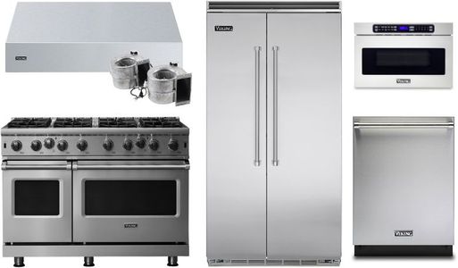 Viking® 6 Piece Stainless Steel Kitchen Package with a side by side refrigerator, freestanding natural gas range, built in dishwasher, microwave drawer, wall mounted range hood, and internal blowerRead More